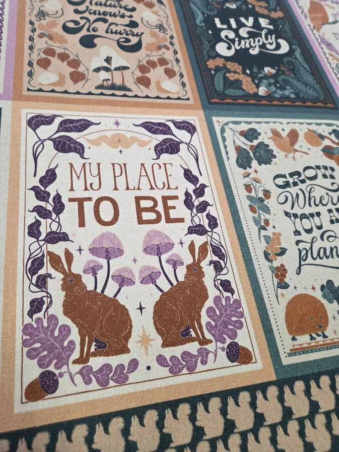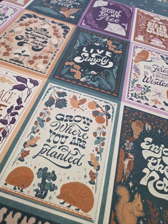 MYO Design Baumwoll Twill / Canvas aus unserer neuen Serie "Stay Wild" - Panels mit schönen Sprüchen und Waldmotiven - ein einzelnes Rechteck ist ca. 23cm hoch und ca. 16,4cm breit. Ein Panel ist eingesamt 90cmx145cm gross