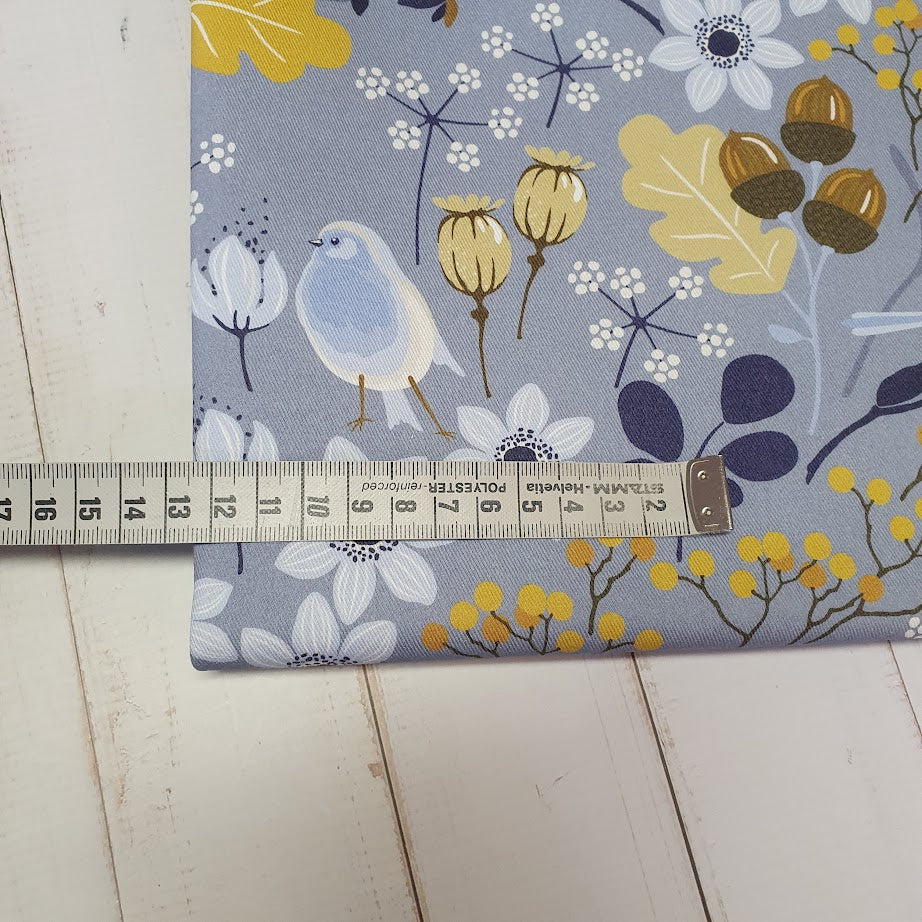 MYO Design Baumwoll Twill / Canvas mit Blumen, Zweigen, Nüssen und Vögelchen auf graublau
